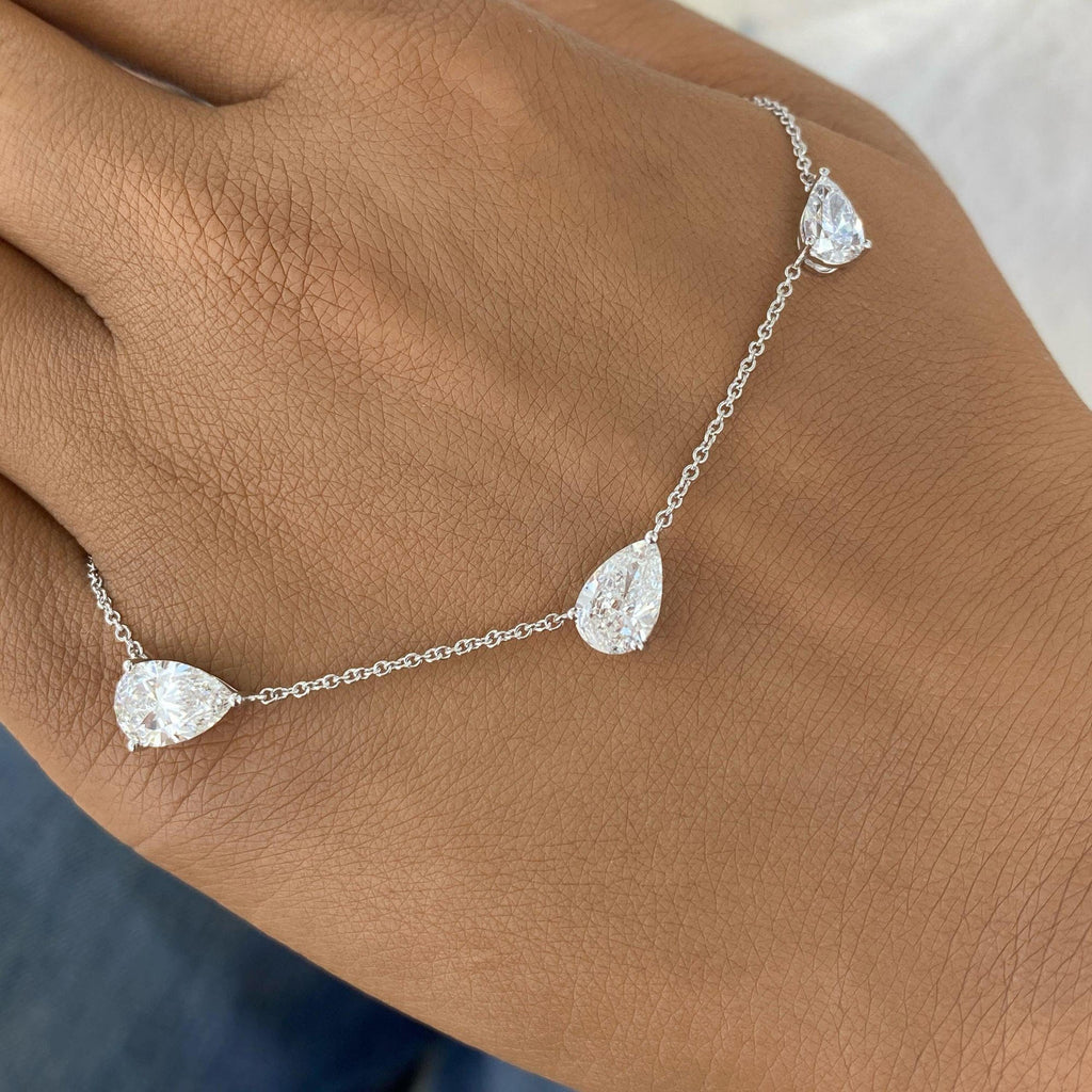 3 Pear Stations Chain Necklace 3 ct TCW , Solid Gold 14k